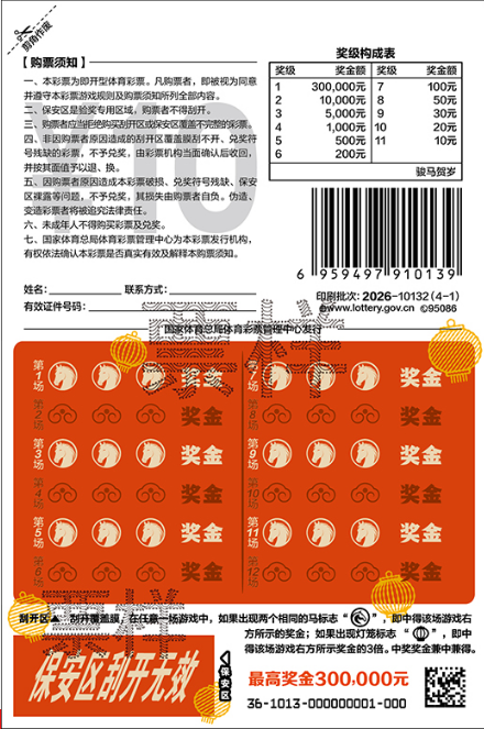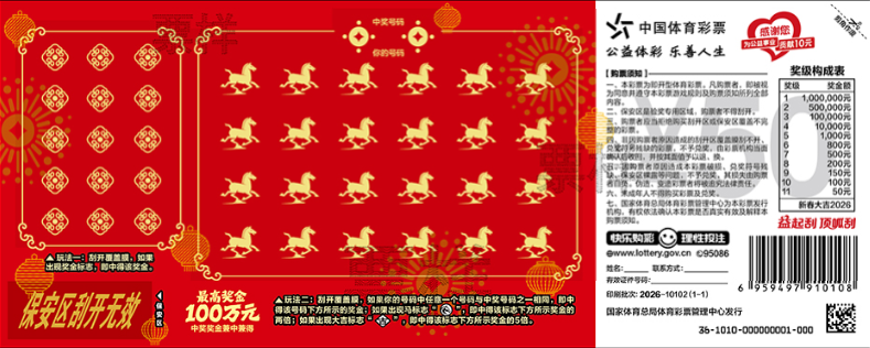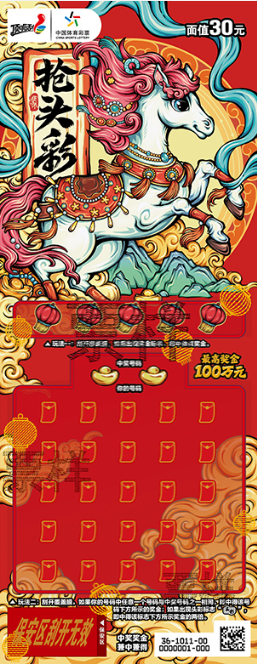 游戏规则:玩法一:刮开覆盖膜,如果出现奖金标志,即中得该奖金。 玩法二:刮开覆盖膜,如果你的号码中任意一个号码与中奖号码之一相同,即中得该号码下方所示的奖金;如果出现“马”标志,即中得该标志下方所示奖金的两倍;如果出现“大吉”标志,即中得该标志下方所示奖金的5倍。