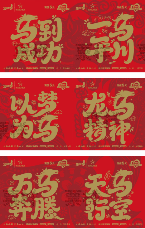 根据《财政部关于“为中国力量加油 雪舞龙腾”等14款即开型体育彩票游戏的审批意见》(财综〔2025〕36号)的要求,我中心将于2026年1月上市“午马”等6款即开型体育彩票游戏,具体如下:5元“午马”、10元“骏马贺岁”、20元“为中国力量加油 雪舞龙腾”、20元“马到成功”、30元“抢头彩2026”、50元“新春大吉2026”。