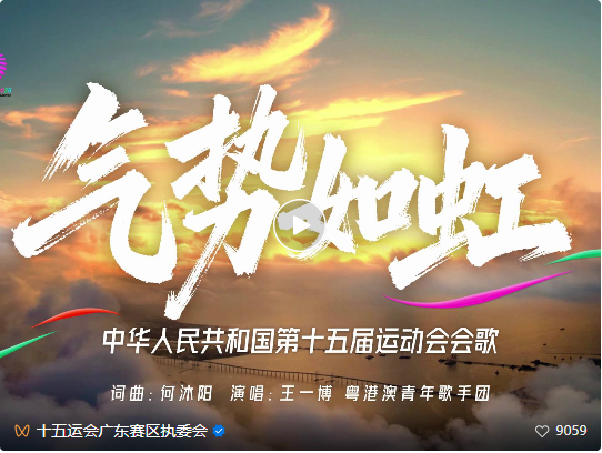 10月9日,中华人民共和国第十五届运动会会歌《气势如虹》及MV正式发布。歌曲由中国音乐家协会副主席、深圳大学金钟音乐研究院院长何沐阳作词作曲,MV由歌手、演员王一博及粤港澳三地青年歌手共同演绎。这首歌以中华传统文化为根脉、体育精神为内核,通过激昂旋律与鲜活意象,生动展现运动激情、奋进姿态,唱响大国之势、势不可挡的时代强音。