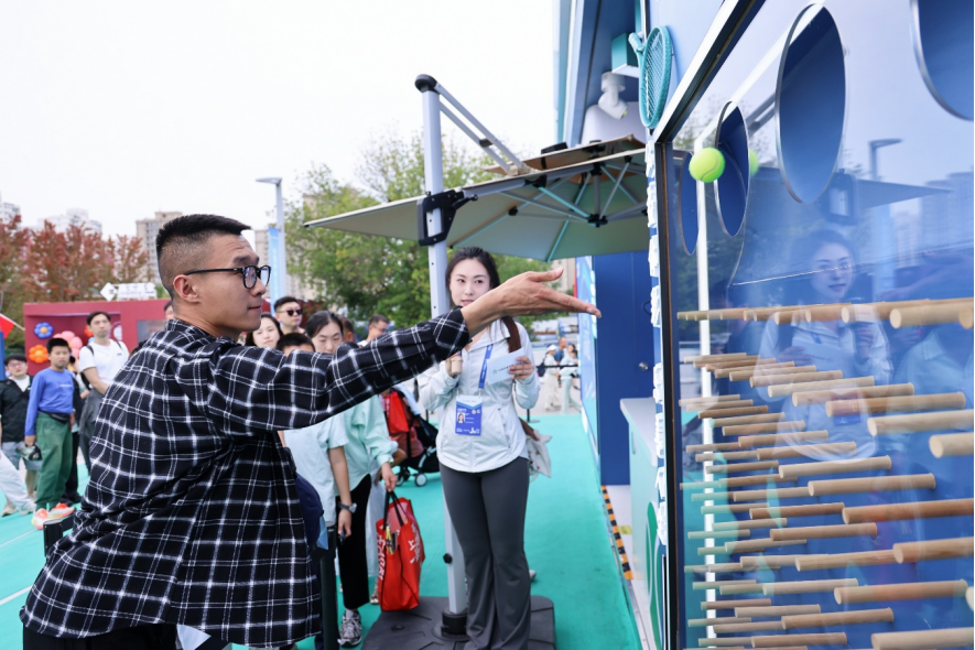 “比看球员发球还紧张!”李先生与同伴击掌时的兴奋,恰是“将网球运动元素融入互动”的设计初心——用观众熟悉的运动场景降低参与门槛,让体验更具代入感。孩子们蹦跳投球、领取定制徽章、在打卡墙前留影的画面,更让展区成为“全龄友好”的欢乐空间,细节处尽显服务温度。