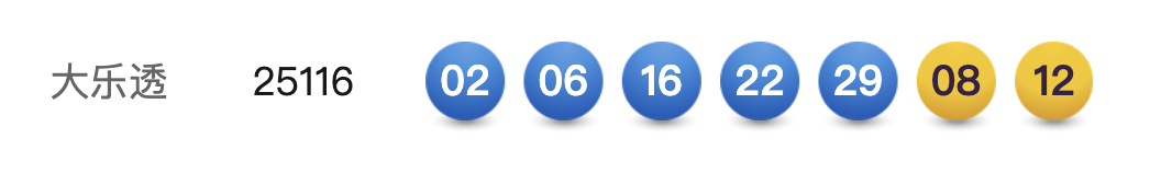 10月13日,超级大乐透第25116期开奖。前区开出号码02、06、16、22、29 ;后区开出号码08、12。本期全国销售2.98亿元,为国家筹集彩票公益金1.07亿元。