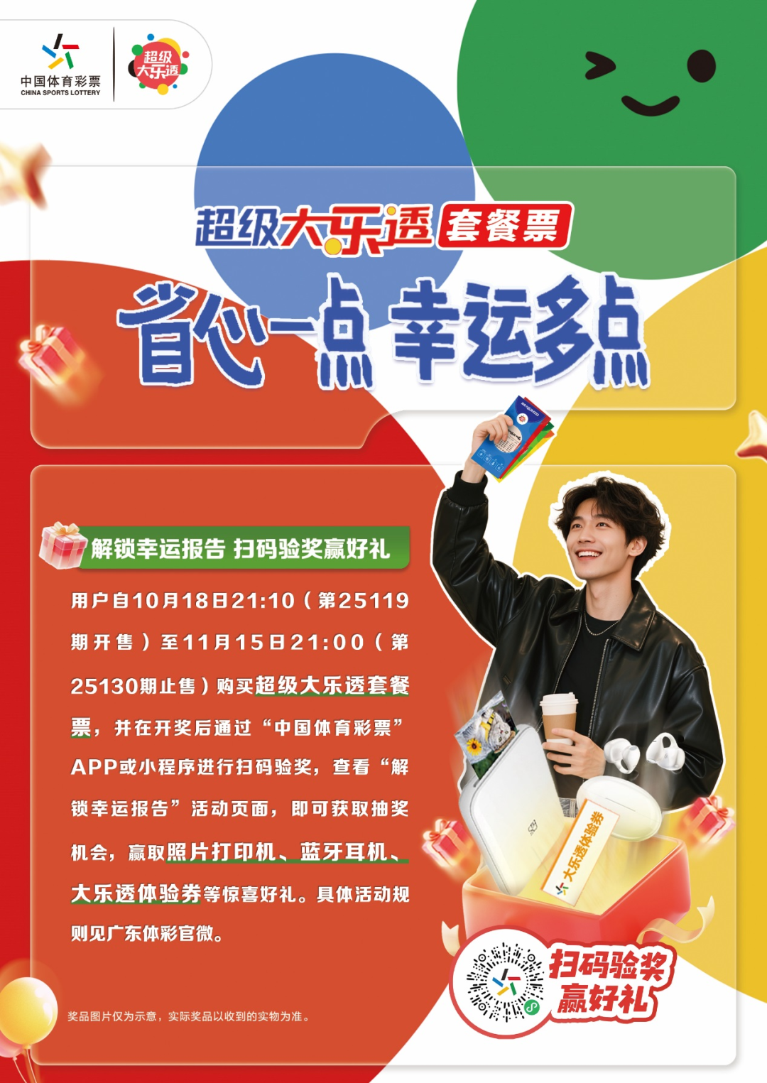 2025年10月18日21:10(第25119期开售)至11月15日21:00(第25130期止售),只要你在广东体彩电彩实体店购买体彩大乐透套餐票,开奖后在11月17日23:59:59前通过“中国体育彩票”APP或微信小程序扫码验奖,就能点击进入“解锁幸运报告”专属页面。每张套餐票都有自己独一无二的“幸运身份”哦!