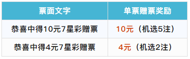 2025年10月20日00:00:00-12月9日23:59:59,购彩者购买7星彩一票10注彩票,根据票面文字信息可获得对应7星彩赠票奖励。具体如下: