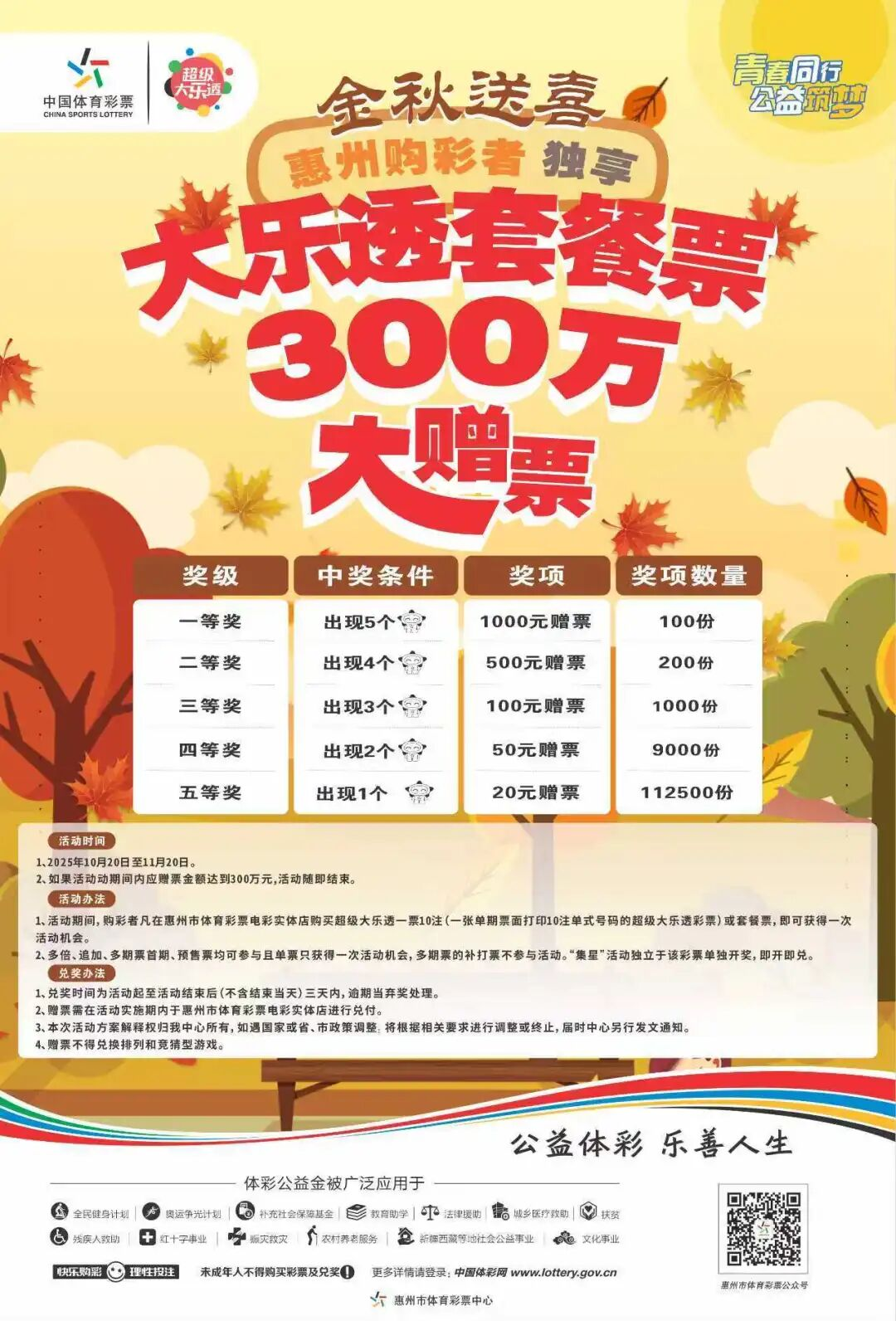 为感谢广大购彩者对体育彩票及公益事业的支持与厚爱,惠州市体育彩票中心于2025年10月20日至11月20日期间,推出惠州体彩大乐透套餐票300万大赠票活动!