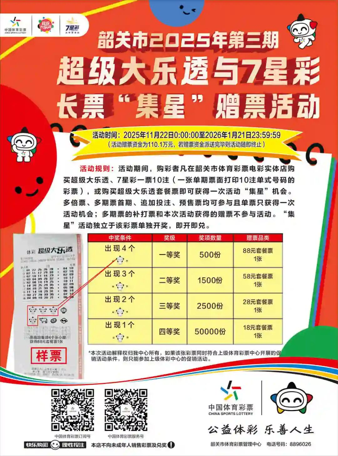 今年,韶关体彩推出了超级大乐透与7星彩长票“集星”赠票活动,第一期和第二期活动反响热烈,购彩者参与热情高涨。为继续答谢广大购彩者对公益体彩的支持,近日,韶关体彩将开展第三期超级大乐透与7星彩长票“集星”赠票活动,110.1万元的赠票等你来拿,快来参与吧!