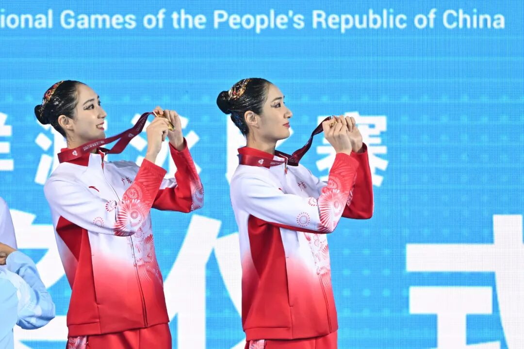 图三:获得冠军的广东队组合王柳懿王芊懿在领奖台上向观众展示金牌