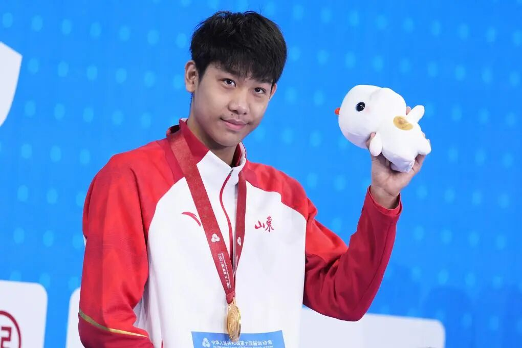 浙江队选手汪顺在比赛后庆祝夺冠。