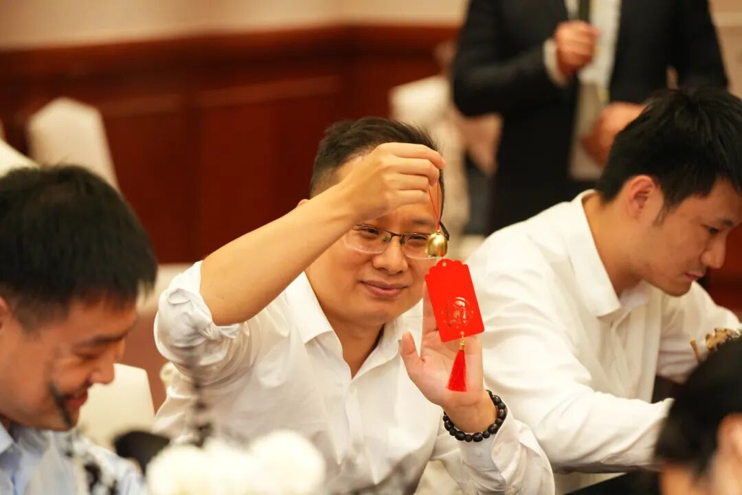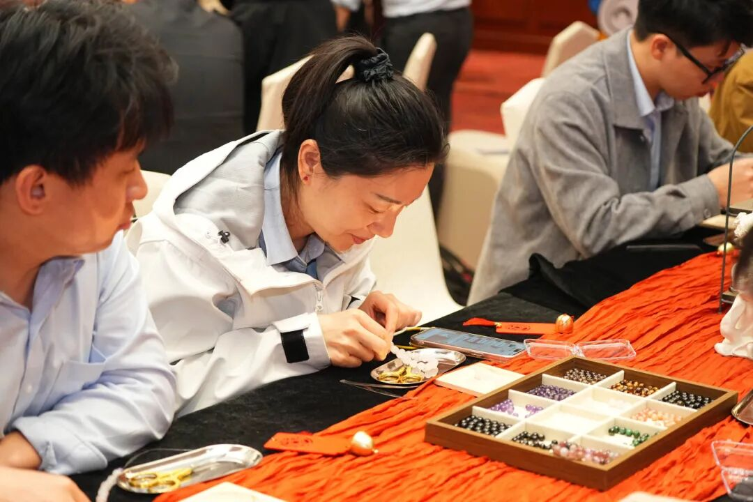 非遗国潮手作环节的现场布置尤为精心,处处彰显巧思:桌面以沉稳的深色桌布为底,上方覆盖着温润典雅的橙色桌旗,色彩对比间尽显格调,桌上错落摆放着多款水晶项链装饰摆件与质感细腻的雕纹盒,为现场增添了几分雅致韵味,让金融白领们在忙碌之余快速卸下疲惫。