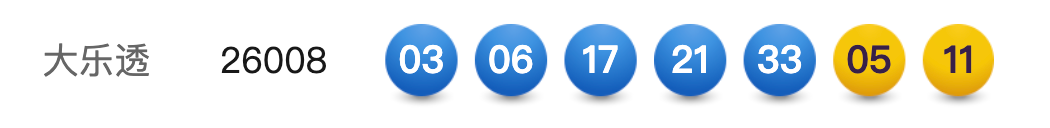 1月19日,超级大乐透第26008期开奖。前区开出号码03、06、17、21、33 ;后区开出号码05、11。本期全国销售3.01亿元,为国家筹集彩票公益金1.08亿元。