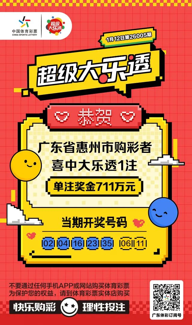 2026年1月12日,体彩超级大乐透第26005期开奖,位于惠州市大亚湾南边灶安置小区B区34号的4411030810体彩实体店迎来开年红,该店一购彩者喜中超级大乐透一等奖,这是当期全省唯一中出的一注大乐透一等奖,奖金高达711万元。