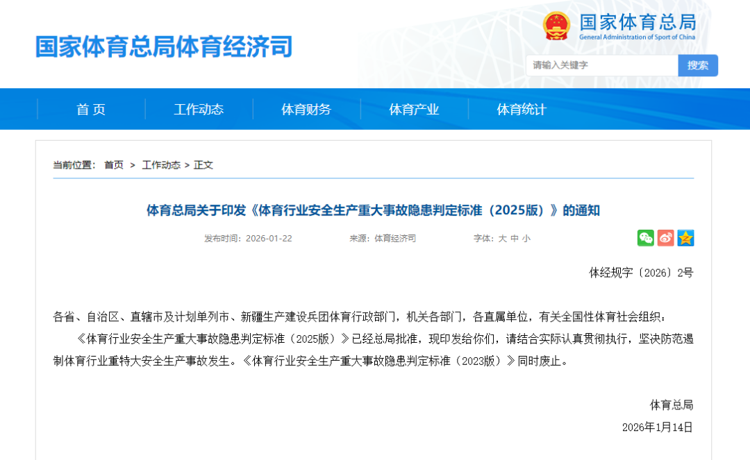 为贯彻落实中央关于安全生产工作部署,针对体育行业安全生产新形势,近日,国家体育总局修订印发《体育行业安全生产重大事故隐患判定标准(2025版)》(以下简称《判定标准》,点击可查看《判定标准》全文),指导科学排查、及时消除体育行业安全生产重大事故隐患,坚决防范遏制重特大事故发生,切实保障人民群众生命财产安全与体育事业健康发展。