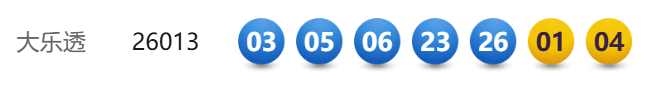 1月31日,超级大乐透第26013期开奖。前区开出号码03、05、06、23、26 ;后区开出号码01、04。本期全国销售3.50亿元,为国家筹集彩票公益金1.26亿元。