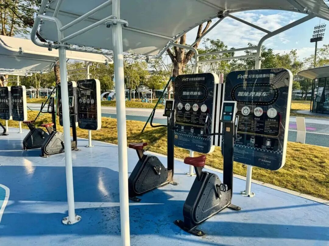 室外智能健身房配备高拉推举、腿部屈伸等八类双功能训练器,实现“测试-训练-测试-提高”的科学健身闭环;