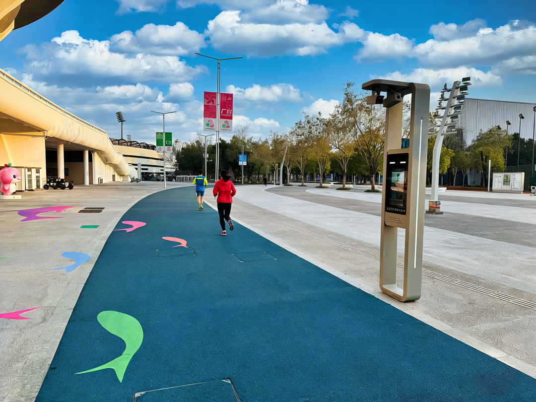 为最大化发挥全运场馆的社会效益,奥体中心通过改造新增2.8万平方米公共体育空间,建成室内800米环形智慧健身跑道与3000米户外智慧跑道,将二层平台升级为全天候健身平台,室外广场改造为集运动、休闲、健身于一体的智慧健身广场及智慧体育公园。