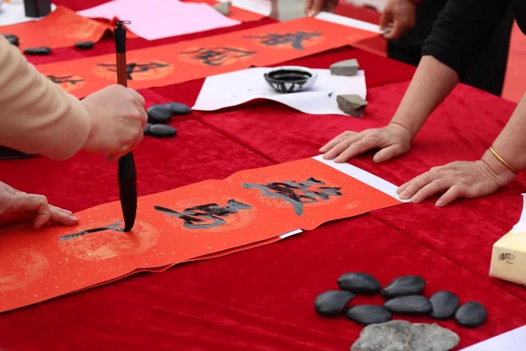 市集人气最旺的当属“公益赠春联”专区。 湛江市体彩中心特邀多位本土书法名家现场泼墨挥毫,开展“迎新春 送春联”公益活动。市民既可自选经典春联佳句,也可提供定制内容。