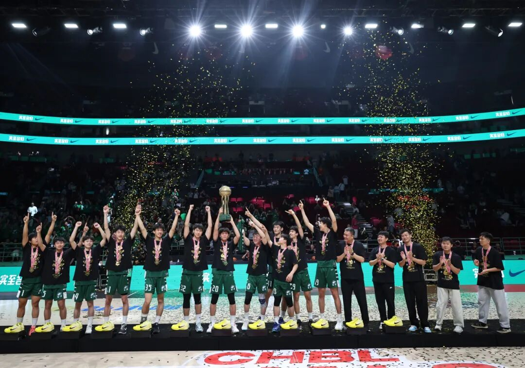 2025年5月25日,在2024-2025赛季耐克中国高中篮球联赛全国总决赛中,广东实验中学队79比75战胜清华大学附属中学队,获得男子组冠军。图/新华社