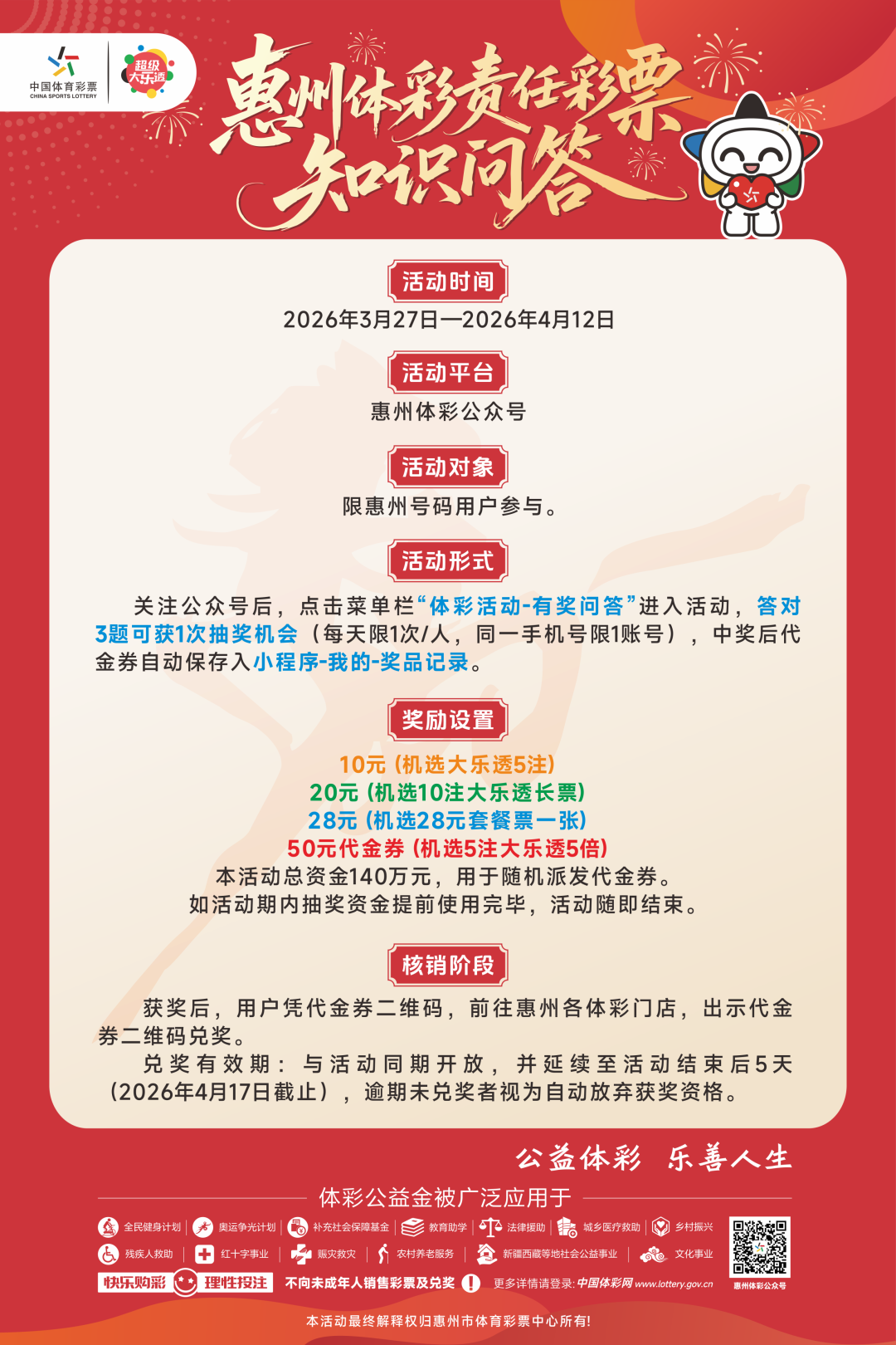 为感恩回馈广大购彩者的支持与热爱,树立“快乐购彩,理性投注”理念,2026年3月27日至4月12日,惠州体彩公众号推出惠州体彩责任彩票知识问答活动,最高可抽50元大乐透代金券!