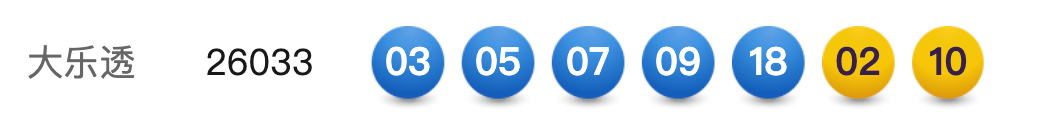 3月30日,超级大乐透第26033期开奖。前区开出号码03、05、07、09、18;后区开出号码02、10。本期全国销售3.19亿元,为国家筹集彩票公益金1.15亿元。广东深圳中得1注基本投注一等奖,出自4402002115体彩实体店。