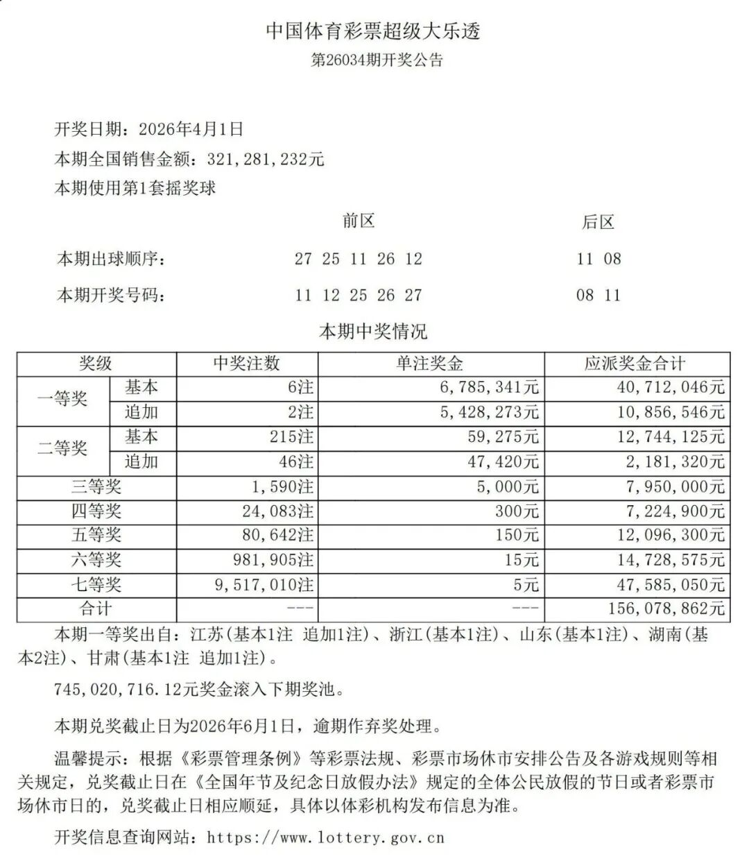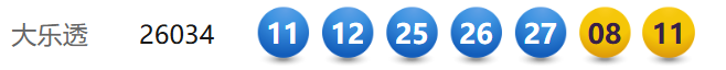4月1日,超级大乐透第26034期开奖。前区开出号码11、12、25、26、27;后区开出号码08、11。本期全国销售3.21亿元,为国家筹集彩票公益金1.15亿元。