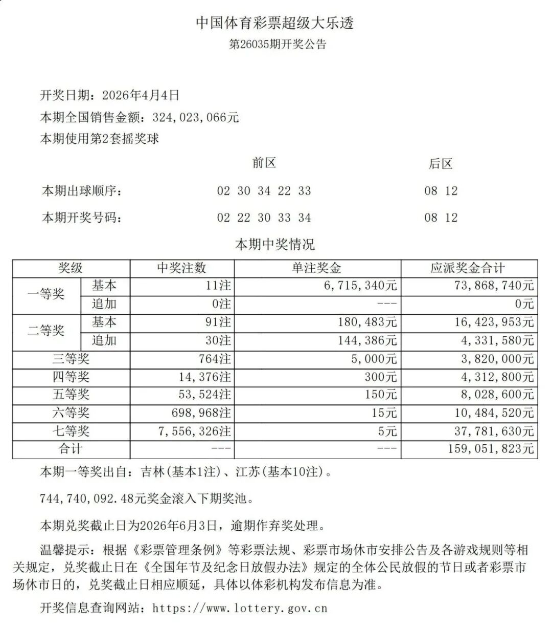 4月4日,超级大乐透第26035期开奖。前区开出号码02、22、30、33、34;后区开出号码08、12。本期全国销售3.24亿元,为国家筹集彩票公益金1.16亿元。