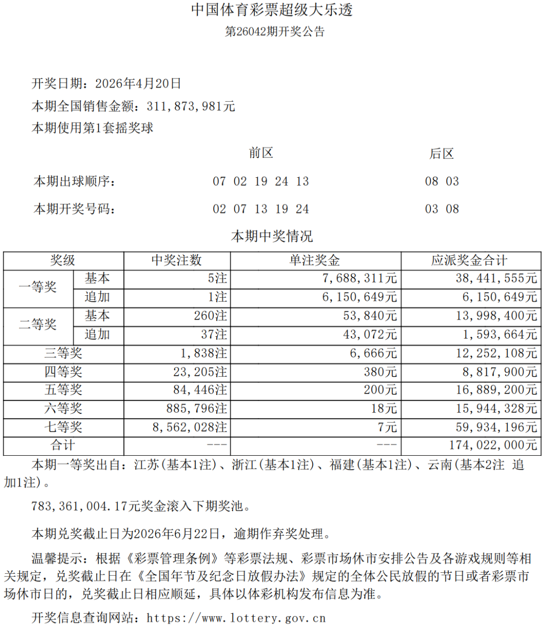 4月20日,超级大乐透第26042期开奖。前区开出号码02、07、13、19、24;后区开出号码03、08。本期全国销售3.11亿元,为国家筹集彩票公益金1.12亿元。