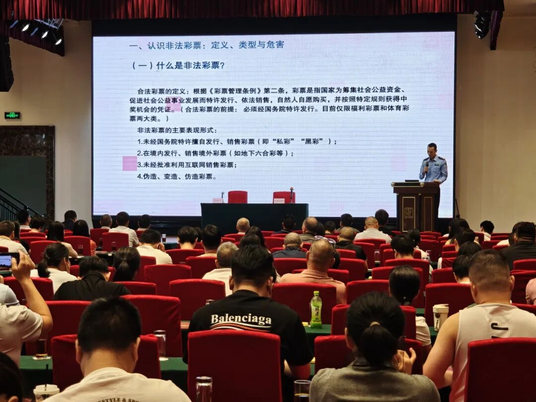 中心还特别邀请了河源市公安局经侦支队一大队丘警官,为全体参会人员带来非法售彩行为法律法规解读及案例分析专题培训。