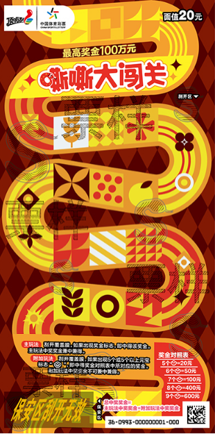 游戏规则:主玩法:刮开覆盖膜,如果你的号码中任意一个号码与中奖号码之一相同,即中得该号码下方所示的奖金;如果出现“十五运会”标志,即中得该标志下方所示奖金的两倍。 幸运玩法:刮开覆盖膜,如果出现奖金标志,即中得该奖金。 中奖奖金兼中兼得。