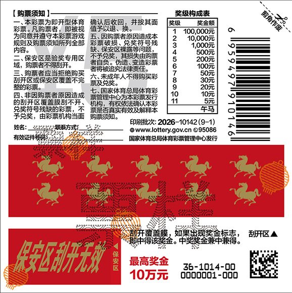 游戏规则:玩法一:刮开覆盖膜,如果出现奖金标志,即中得该奖金。 玩法二:刮开覆盖膜,如果你的号码中任意一个号码与中奖号码之一相同,即中得该号码下方所示的奖金;如果出现“马”标志,即中得该标志下方所示奖金的两倍;如果出现“大吉”标志,即中得该标志下方所示奖金的5倍。