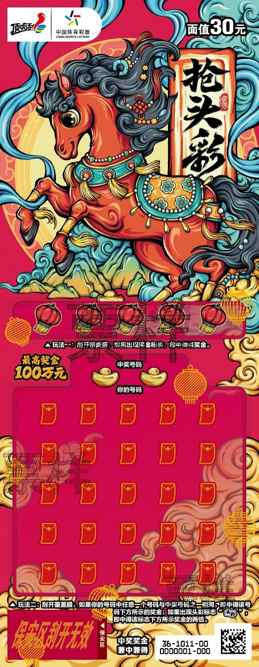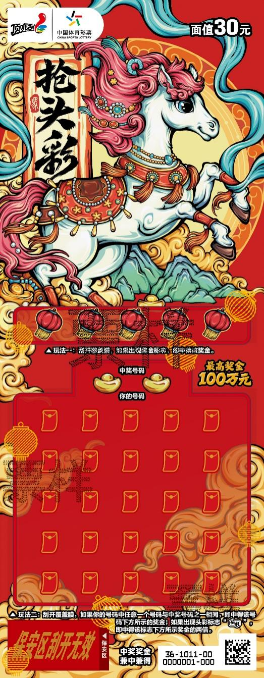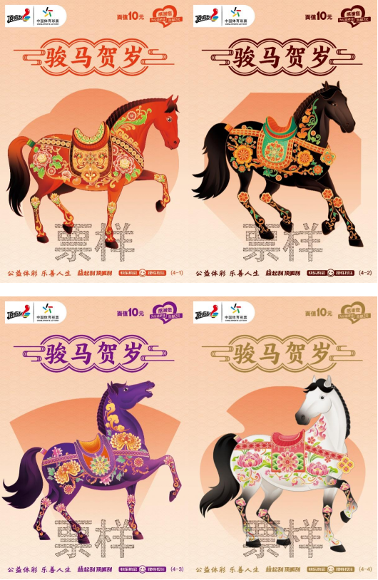 根据《财政部关于“为中国力量加油 雪舞龙腾”等14款即开型体育彩票游戏的审批意见》(财综〔2025〕36号)的要求,我中心将于2026年1月上市“午马”等6款即开型体育彩票游戏,具体如下:5元“午马”、10元“骏马贺岁”、20元“为中国力量加油 雪舞龙腾”、20元“马到成功”、30元“抢头彩2026”、50元“新春大吉2026”。