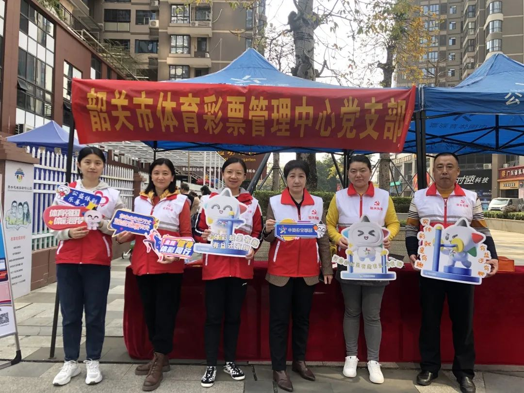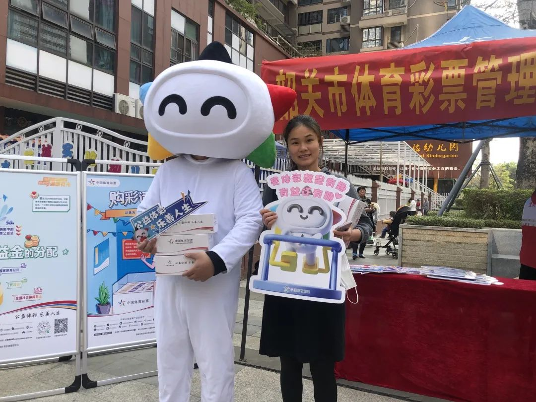 在公益宣传展示区,一个个跟责任彩票相关的海报展架整齐地摆放着,韶关体彩党员志愿者在现场向群众派发责任彩票手册和带有乐小星标志的环保袋、口罩、纸巾、雨伞等礼品,宣传体育彩票的公益性和理性购彩理念。
