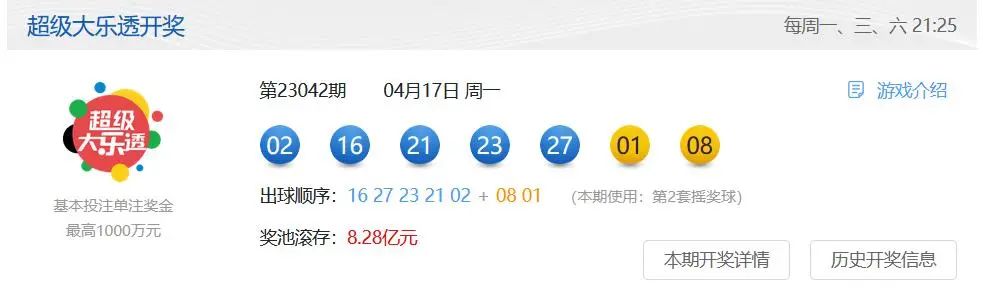 奖池方面,本期开奖结束后,8.28亿元滚存至4月19日(周三)开奖的第23043期。按照超级大乐透10亿元大派奖规则,本期1500万元一等奖派奖金额全部派完,下期一等奖将继续派送1500万元;本期500万元二等奖派奖金额全部派送完毕,下期将继续派送500万元。