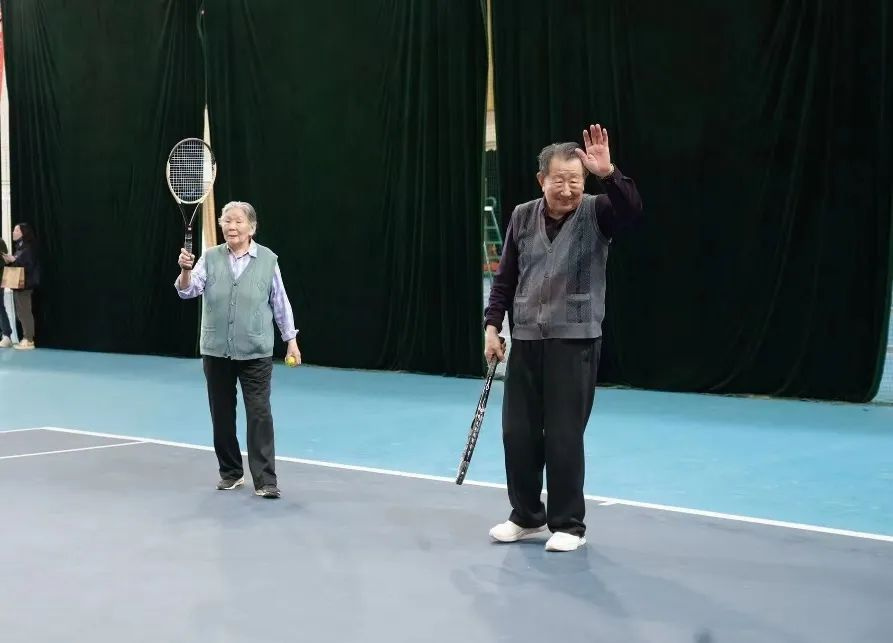 84岁的老奶奶王静荣和她82岁的老伴一组,步履矫健挥拍奋战,一旁的观众席上,还一群平均年龄在70岁以上的老人正在为他们加油呐喊。