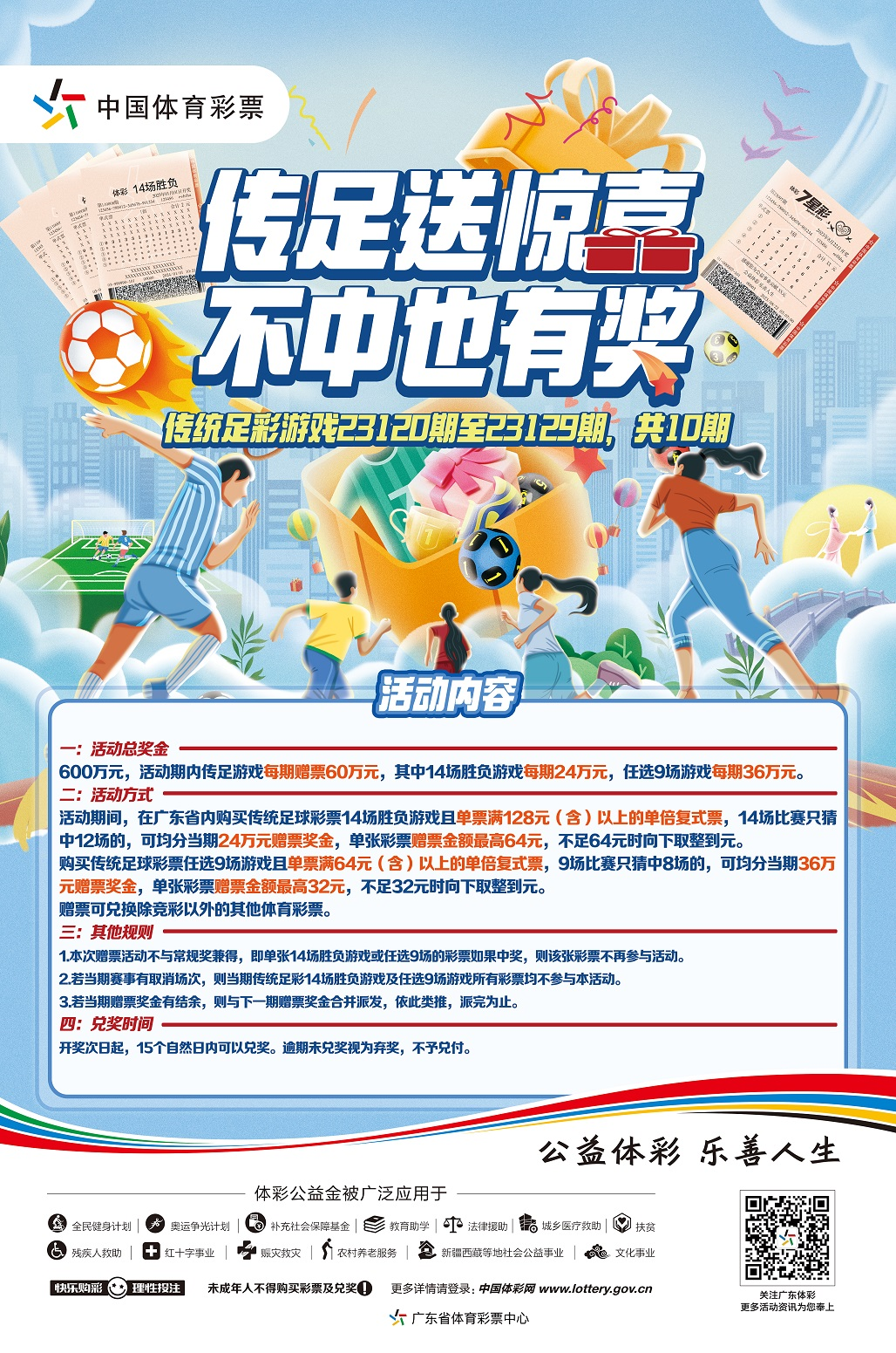 新赛季的足球赛事已在如火如荼的进行中,广东体彩为回馈广大购彩者的支持和喜爱,即将开展“传足送惊喜 不中也有奖”活动。活动的具体内容如下。