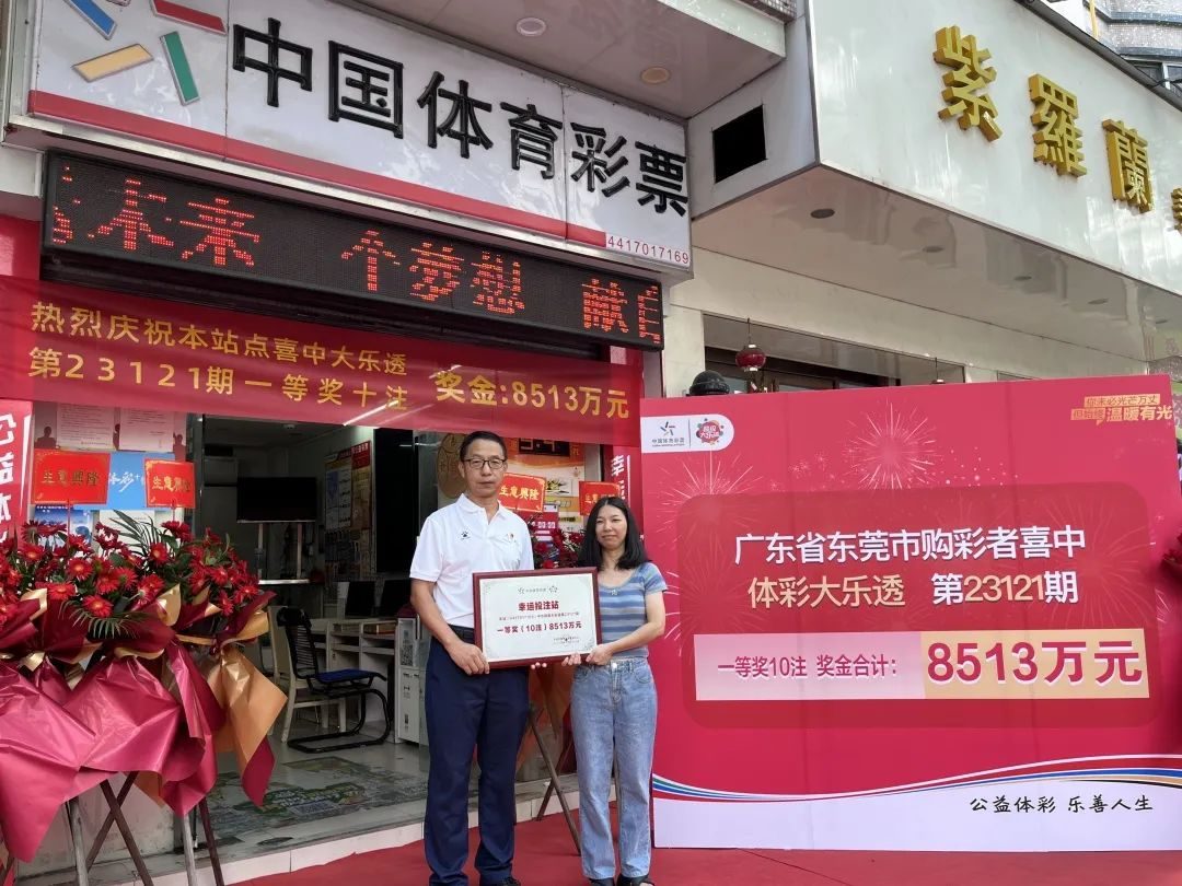 10月23日,体彩超级大乐透第23121期前区开出号码“05、11、15、23、33”,后区开出号码“01、09”。东莞望牛墩镇金牛路紫荆苑2号4417017169实体店中出一张5注号码、10倍投注、100元投入的单式倍投票,单票奖金8513万元,贡献个人偶然所得税1702万余元。本次大奖是继9月份东莞体彩中出1.91亿元之后的历史第二高奖金!