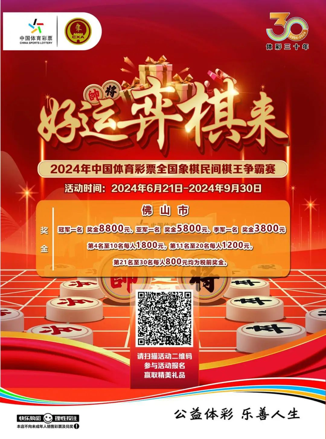“好运‘弈棋’来”——2024年中国体育彩票全国象棋民间棋王争霸赛佛山赛区海选赛举办时间为6月21日-9月30日。佛山市共有35家指定体彩实体店承办海选赛比赛,其中禅城区、南海区各有10家,顺德区8家、高明区4家、三水区3家。佛山体彩选择了面积较大或有在店外开展比赛活动条件的实体店作为承办海选赛比赛场地,并结合“体彩+”建设,为其配备象棋比赛用品,配发宣传物料,为各实体店打造“棋王对弈角”,为象棋爱好者提供良好的弈棋环境。
