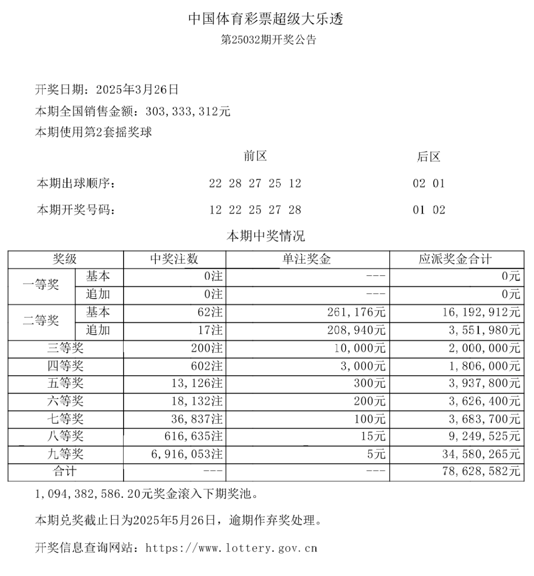 3月26日,超级大乐透第25032期开奖。前区开出号码12、22、25、27、28;后区开出号码01、02。本期全国销售3.03亿元,为国家筹集彩票公益金1.09亿元。