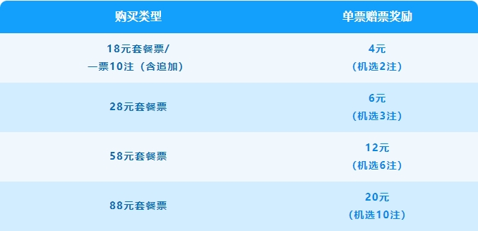 活动时间内,购彩者购买超级大乐透一票10注彩票(一张单期票面打印10注单式号码的超级大乐透彩票)或套餐票,即可获得对应超级大乐透赠票奖励,具体如下: