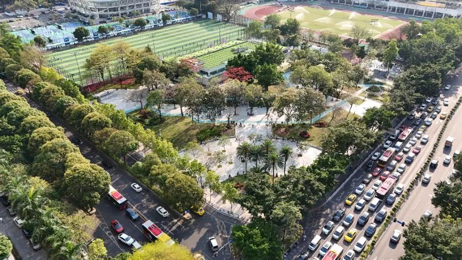 以天河体育中心为例,作为城市中轴线上的重要节点,天体采用“双轴、一心、双环、多联”的空间布局,在强化城市轴线视觉延续性的同时,还新增多个“街角公园”,通过植被品种优化与层次调整提升景观品质,拆除围栏实现“拆围透绿”的视觉联通。