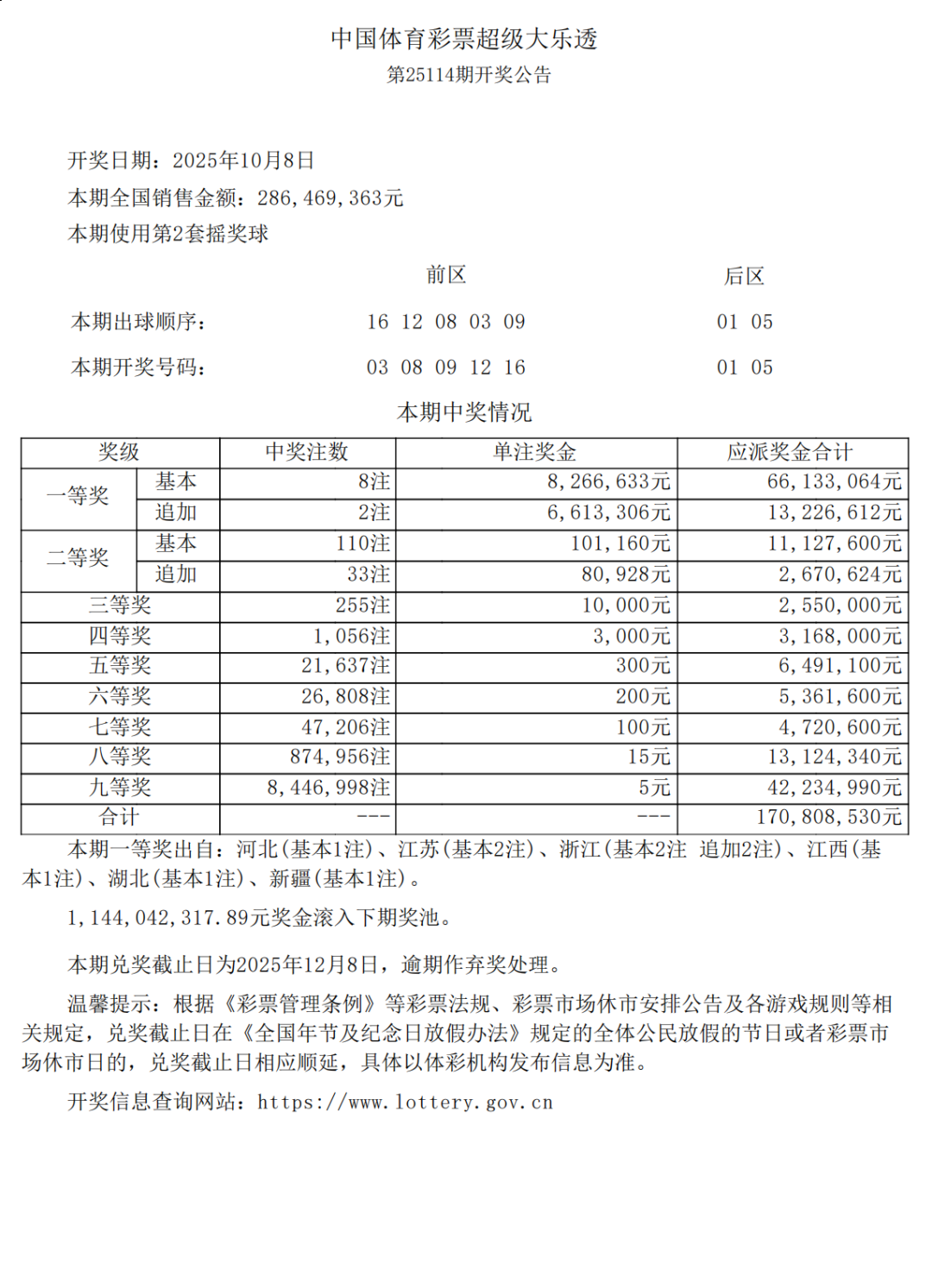 10月8日,超级大乐透第25114期开奖。前区开出号码03、08、09、12、16;后区开出号码01、05。本期全国销售2.86亿元,为国家筹集彩票公益金1.02亿元。