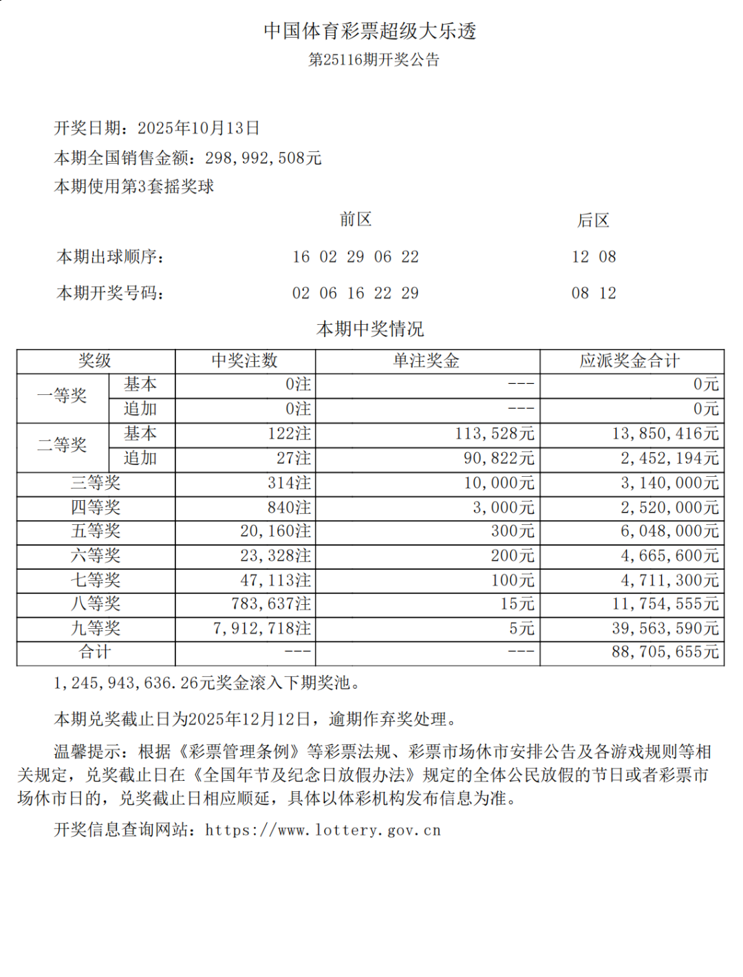 10月13日,超级大乐透第25116期开奖。前区开出号码02、06、16、22、29 ;后区开出号码08、12。本期全国销售2.98亿元,为国家筹集彩票公益金1.07亿元。