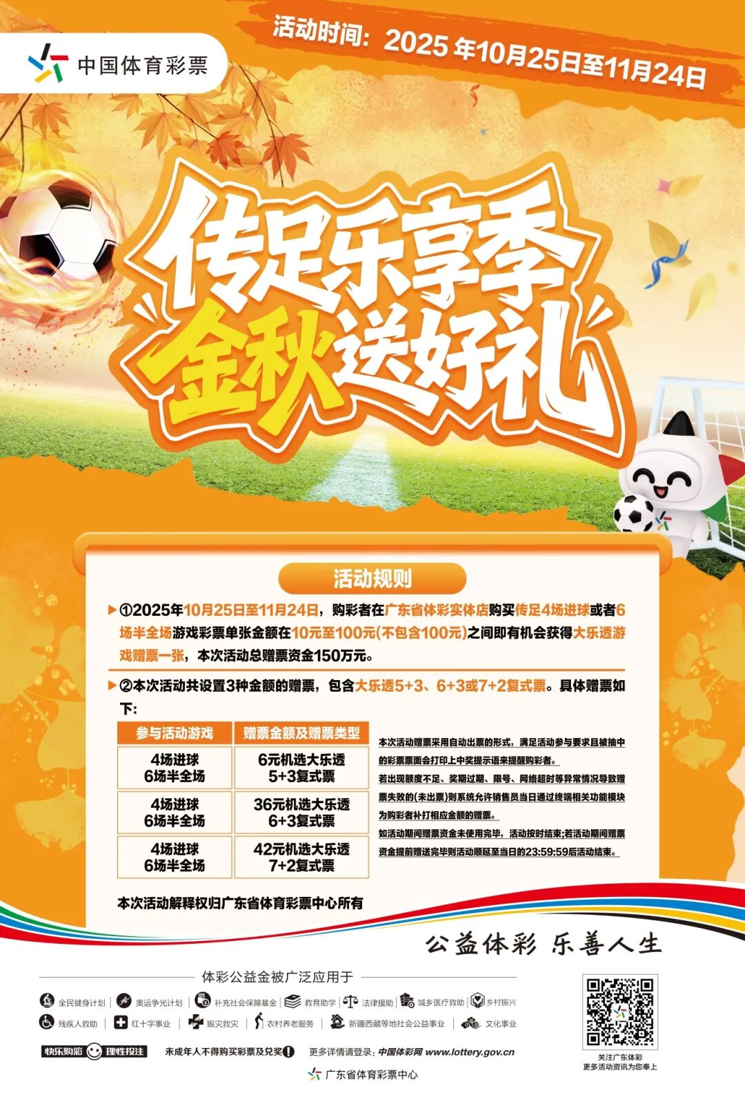 秋风送爽,好礼来袭!为回馈广大购彩者对传统足彩的长期支持,广东省体育彩票中心精心策划的 “传足乐享季 金秋送好礼”传足赠票活动,将于2025年10月25日至11月24日火热开启!