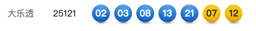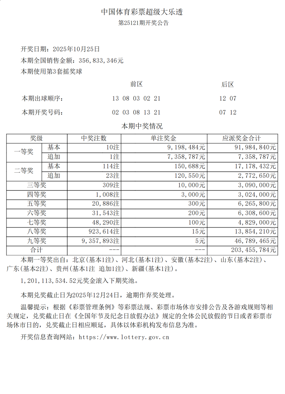 10月25日,超级大乐透第25121期开奖。前区开出号码02、03、08、13、21;后区开出号码07、12。本期全国销售3.56亿元,为国家筹集彩票公益金1.28亿元。其中,广东深圳中得2注基本投注一等奖,分别出自4402038239、4402039819体彩实体店。