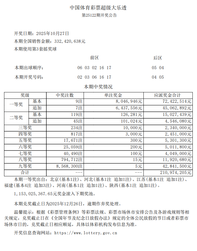 10月27日,超级大乐透第25122期开奖。前区开出号码02、03、06、16、17 ;后区开出号码04、05。本期全国销售3.32亿元,为国家筹集彩票公益金1.19亿元。