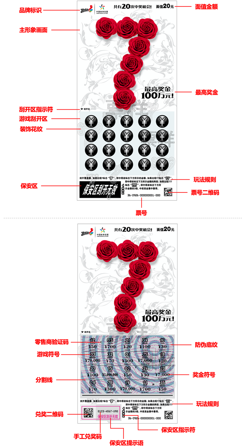 2.保安区和刮开区都有覆膜,票面印有专属防伪装饰纹,贯穿覆膜区域和非覆膜区域的防伪装饰纹是完整图案,购买的时候要注意观察。