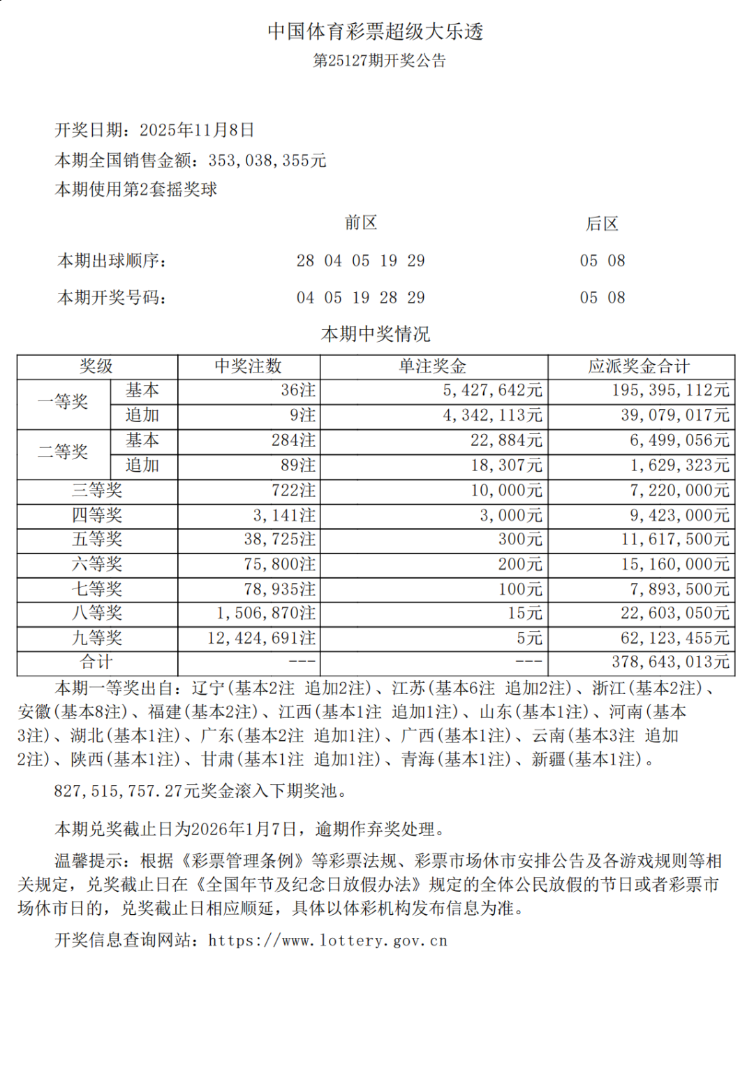 11月8日,超级大乐透第25127期开奖。前区开出号码04、05、19、28、29 ;后区开出号码05、08。本期全国销售3.53亿元,为国家筹集彩票公益金1.27亿元。其中,广东广州中得1注基本投注一等奖,出自4401027671体彩实体店;广东佛山中得1注追加投注一等奖,出自4422022280体彩实体店。