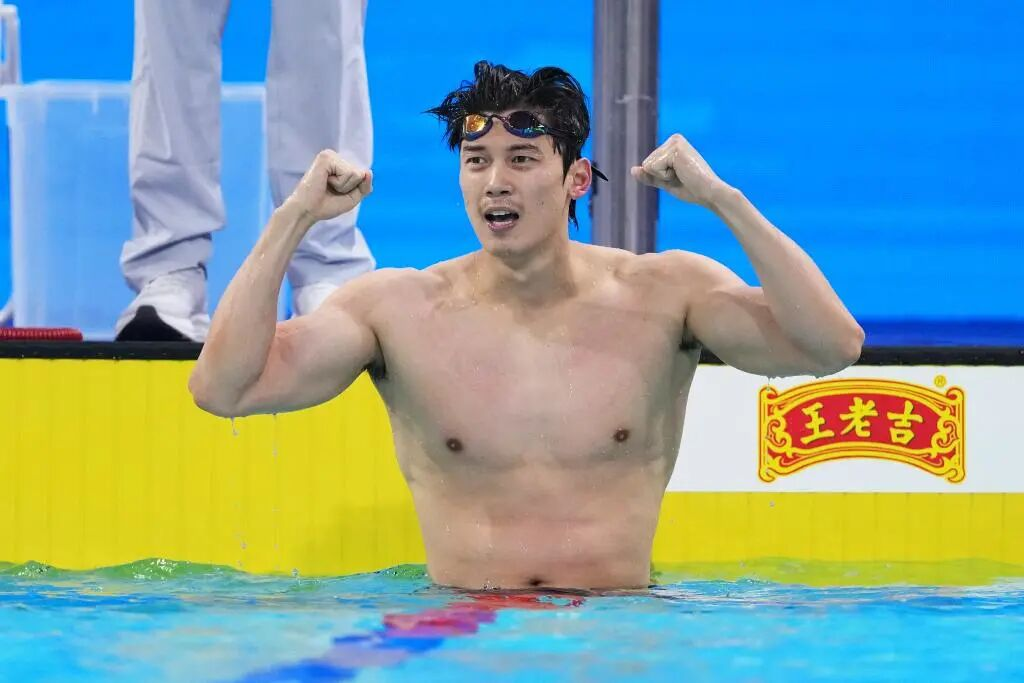 浙江队选手汪顺在比赛后庆祝夺冠。