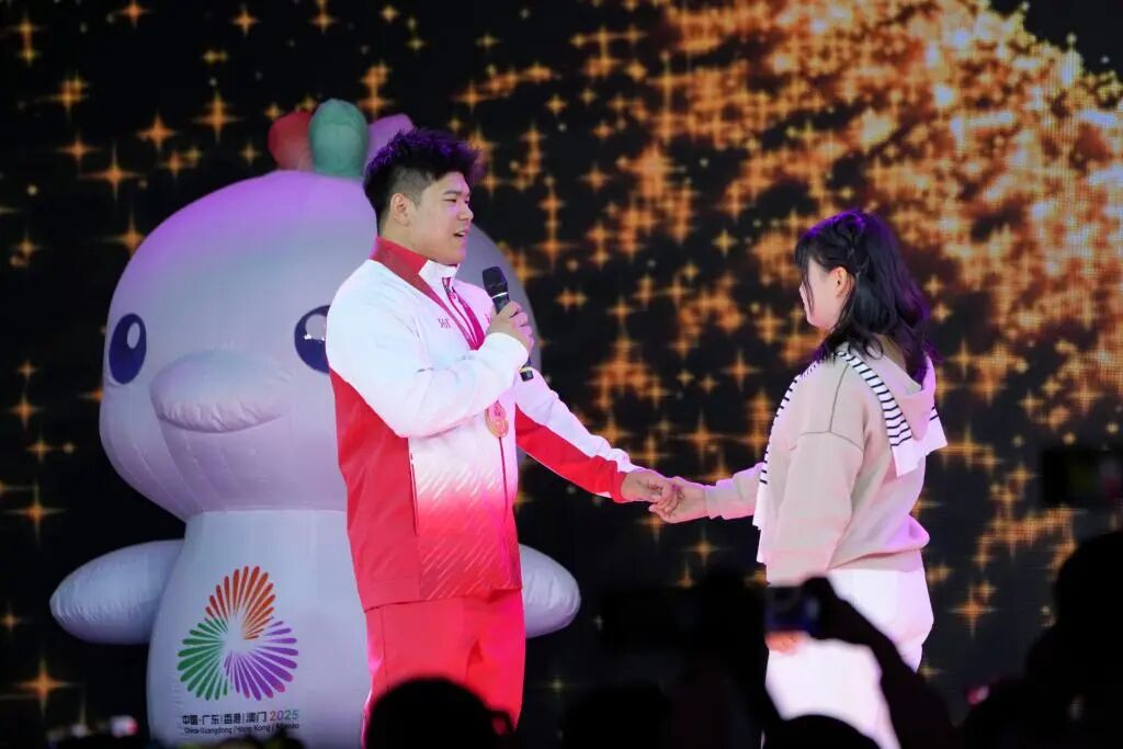 11月17日,冠军山东队选手张展硕在颁奖仪式上挥舞吉祥物喜洋洋。