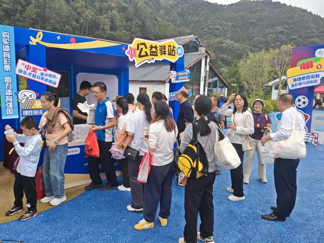 在林家铺子广场,最吸引人眼球的,当属韶关市体育彩票管理中心开展的“迈开步 动出彩”体育公益进社区宣传活动。活动设置了公益金宣传区、趣味打卡活动区、游园游戏区等,吸引众多游客朋友排队参与,现场热闹非凡。