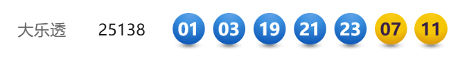 12月3日,超级大乐透第25138期开奖。前区开出号码01、03、19、21、23 ;后区开出号码07、11。本期全国销售2.99亿元,为国家筹集彩票公益金1.07亿元。