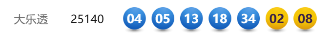 12月8日,超级大乐透第25140期开奖。前区开出号码04、05、13、18、34;后区开出号码02、08。本期全国销售2.94亿元,为国家筹集彩票公益金1.06亿元。其中,广东广州中得1注基本投注一等奖,出自4401023140体彩实体店。